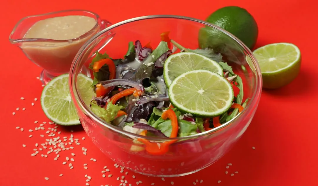 - Para la vinagreta: aceite de sésamo, soja ligera, miel, jengibre rallado y zumo de lima.
