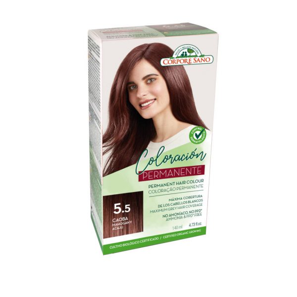 La línea de tintes permanentes de Corpore Sano es la auténtica revolución, con una fórmula que proporciona una coloración de larga duración y protección al cabello. La coloración cubre la totalidad de las canas y consigue un color luminoso. Su fórmula excluye ingredientes como el amoníaco, el resorcinol, la parafenilendiamina (PPD) y los conservantes parabenos. El aceite de semillas de Sésamo aporta al pelo nutrición y protección del color gracias a su alto contenido en vitamina E y ácidos grasos. El extracto de Girasol aporta brillo y protección al cabello. La Keratina Vegetal contiene una combinación de 18 aminoácidos naturales, obtenidos del Trigo y de la Soja de estructura similar a la keratina natural del cabello. Protege la estructura interior del cabello aportándole color brillante y tacto suave. Color: 5.5 Caoba. El color obtenido en el cabello dependerá de su color actual.