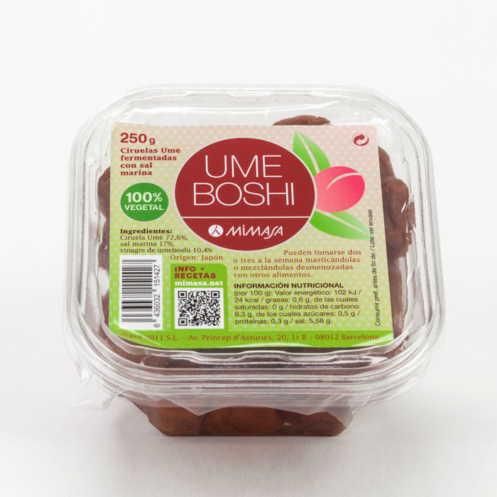 La umeboshi natural de Mimasa se presenta en unidades enteras de ciruelas. Es el producto básico de esta categoría, fermentado con procesos totalmente naturales a partir de la fruta umé. Por lo general, la recolección de la fruta umé comienza en mayo, pero las umeboshi de Mimasa se recolectan en junio, para asegurar que el fruto esté completamente maduro. El mismo día de la recolección, las ciruelas umé se ponen a macerar con sal. La cantidad de sal viene determinada por la calidad de la umé y la intuición y los años de experiencia de quien las prepara. Un mes después de la maceración con sal, las frutas umé se secan tres días a pleno sol. Se van girando para que el secado sea uniforme en ambos lados.Una vez seca, la umé vuelve a macerarse siguiendo métodos tradicionales para conseguir el mejor sabor y aroma, característicos de un producto preparado de forma artesanal. Todo este proceso se sigue haciendo hoy en día a mano. A pesar de la sal que contienen, no hay que lavar con agua las umeboshi de Mimasa antes de comerlas. Ácido y salado se equilibran entre sí y, por ello, resultan muy efectivos para calmar la sed. En síntesis, lo ácido de la umeboshi neutraliza el exceso de yang (carne, sal, proteínas), mientras que la sal neutraliza un estado demasiado ácido (yin), originado por excesos de azúcar, cereales refinados y productos lácteos.